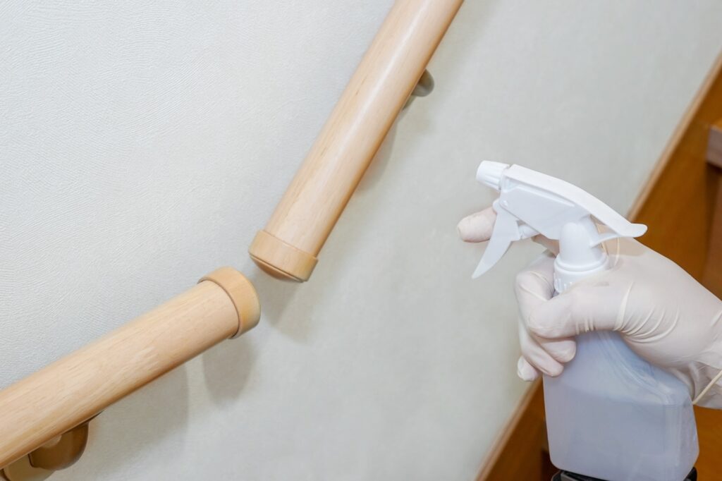 保育室では、ドアノブ、手すり、照明のスイッチなど、多くの人が触れる場所を定期的に水拭きし、その後アルコール消毒するのが効果的です。